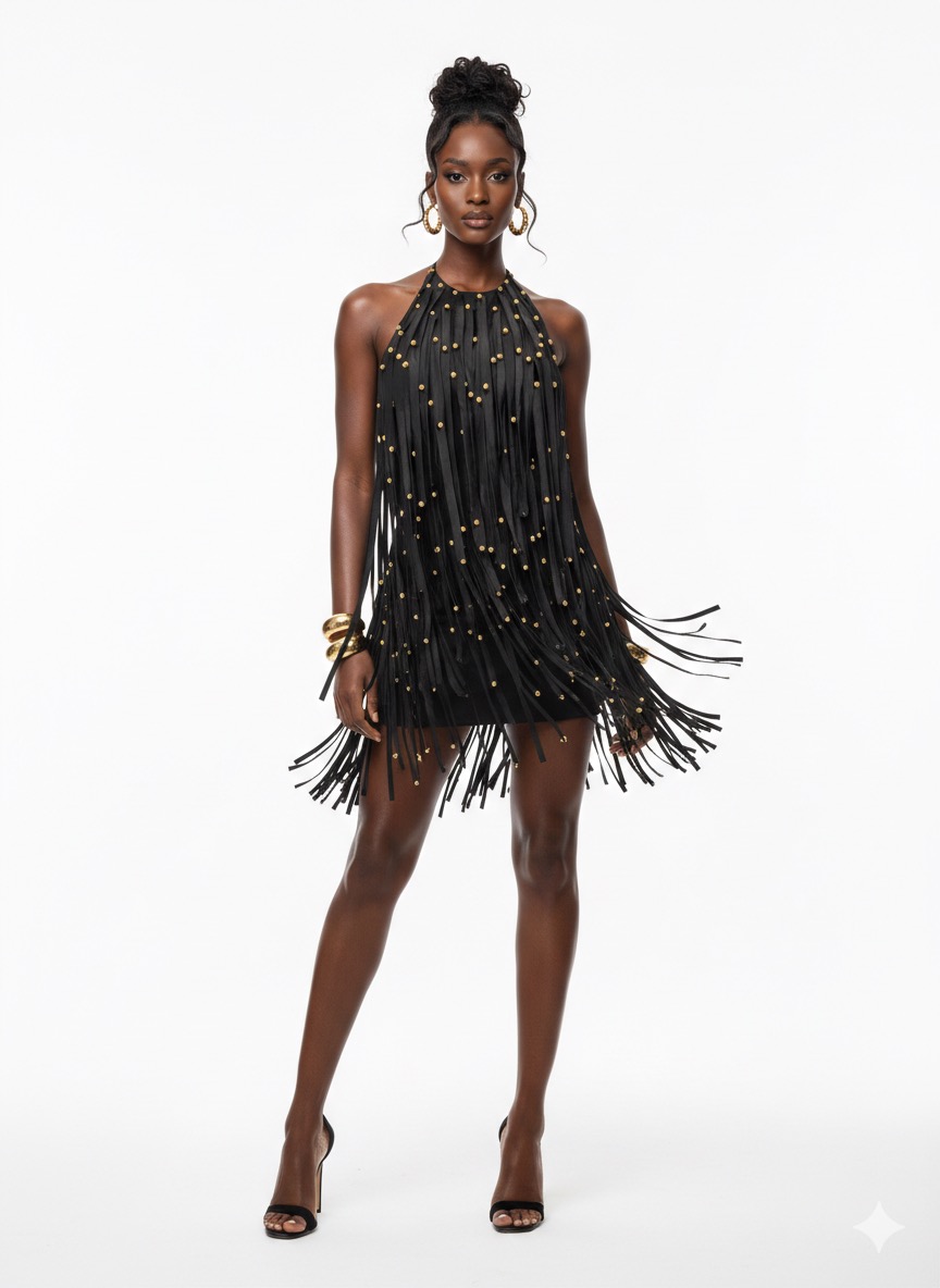 The ÀJÀLA Mini Dress is a sleeveless, high-neck halter mini dress crafted in deep black with hand-stitched silk fringes and gold pearl embellishments, designed for movement, glamour, and confident presence.